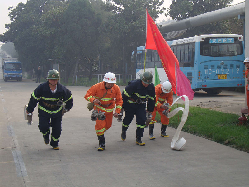 參加演練活動的有各部門、分廠及公司外協(xié)施工單位等200余人。演練前,公司消防員組織演練人員參觀“11.9”消防安全宣傳板報,向他們講解滅火器的使用方法和適用范圍、防化服的穿著和空氣呼吸器的使用方法及火災發(fā)生后如何逃生等。接著,公司消防隊員演示了明火撲救、兩盤水帶的連接和出水以及五盤水帶連接和出水。最后,各部門、分廠及施工單位進行了明火撲救,應急逃生等演練。