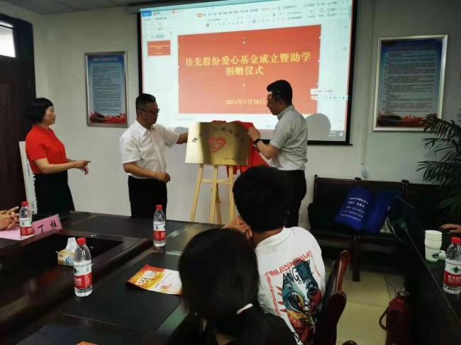 儀式現(xiàn)場,佳先股份副總經(jīng)理、工會(huì)主席丁柱介紹了公司發(fā)展及參與公益事業(yè)的情況;區(qū)委常委、常務(wù)副區(qū)長程旭和佳先股份董事長李兌共同為“佳先股份愛心基金”揭牌;佳先股份愛心基金向沫河口鎮(zhèn)學(xué)生捐贈(zèng)10萬元。