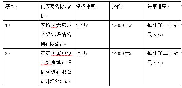 高鐵蚌埠南站西廣場(chǎng)、蚌投科技園物業(yè)服務(wù)費(fèi)評(píng)估項(xiàng)目于2021年10月18日發(fā)布招標(biāo)公告,經(jīng)兩次流標(biāo),第三次招標(biāo)公共于2021年11月04日發(fā)布,2021年11月11日9:00本項(xiàng)目開標(biāo),三家報(bào)名現(xiàn)場(chǎng)兩家參與,按招標(biāo)文件要求現(xiàn)場(chǎng)議價(jià),經(jīng)過專家評(píng)審,經(jīng)與投標(biāo)單位溝通均表示不再下浮,按招標(biāo)文件要求符合議價(jià)程序?,F(xiàn)公告排名如下: